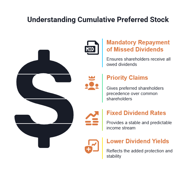 Cumulative preferred shares sit between debt and common equity. They offer fixed dividends—usually based on the par value of the stock—and obligate the company to repay all missed dividends before paying any other equity class. This design helps companies raise capital at a lower cost, since the cumulative feature reduces dividend risk for investors.