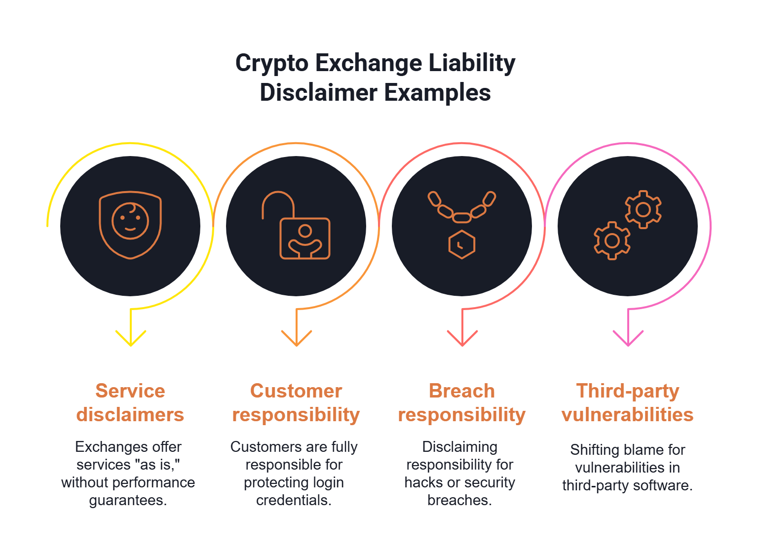 - Disclaiming responsibility for hacks or breaches, sometimes even when the exchange itself is compromised.