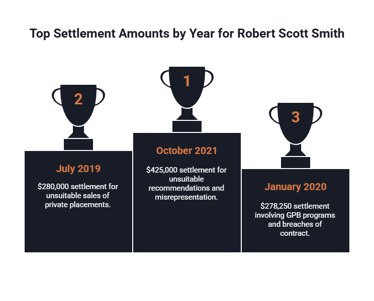Public regulatory records indicate that Robert Scott Smith (CRD 1412333) has a extensive history of disclosable events. While many of these matters reached a settlement without an admission of wrongdoing, the total payouts exceed $1.8 million. These settlements include: