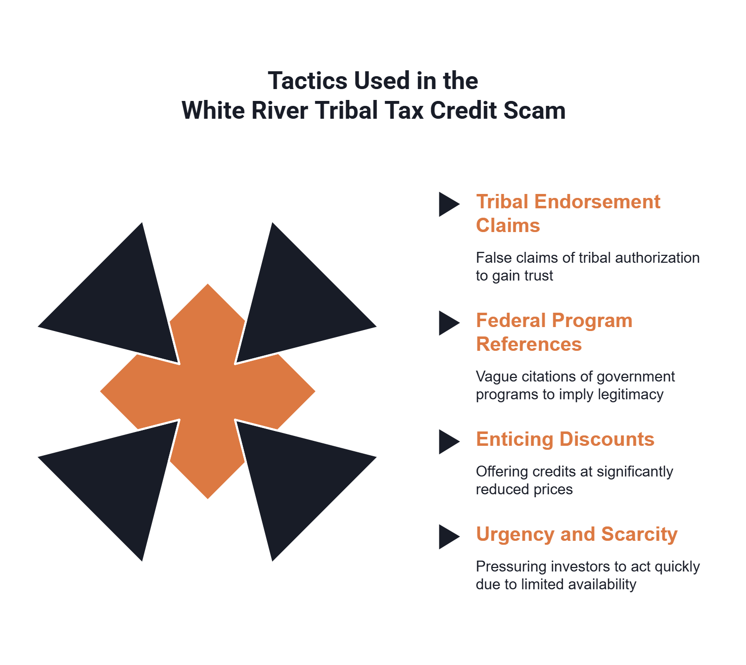 Promoters used misleading tactics such as suggesting tribal endorsement, referencing federal programs, offering steep discounts, and creating urgency. These strategies made the credits appear exclusive and time-sensitive.