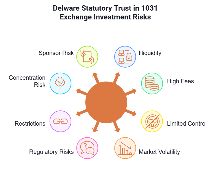 DSTs are illiquid, highly fee-driven, and subject to market volatility. Investors often face lock-up periods of 7–10 years with no ability to sell early.
