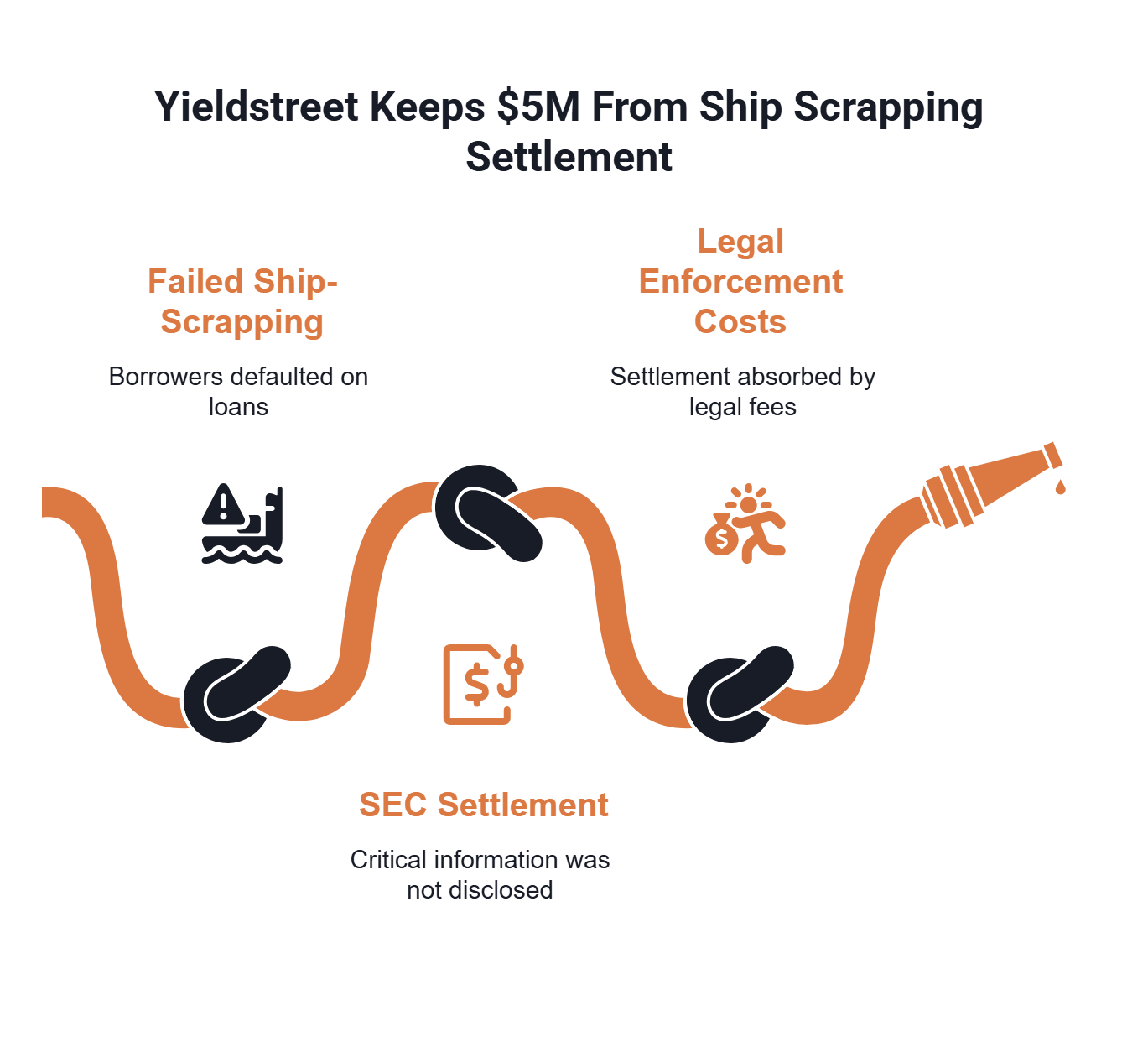 - SEC settlement in 2023: Yieldstreet paid $1.9 million after the SEC alleged it failed to disclose critical information in a $14.5 million offering tied to ship-scrapping.